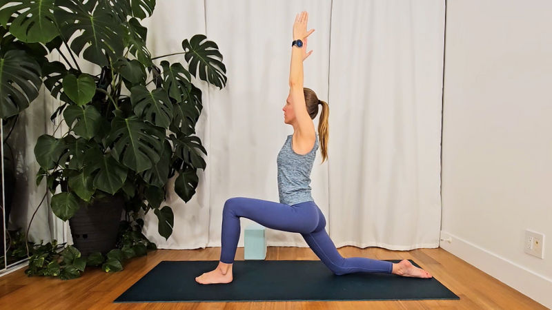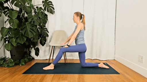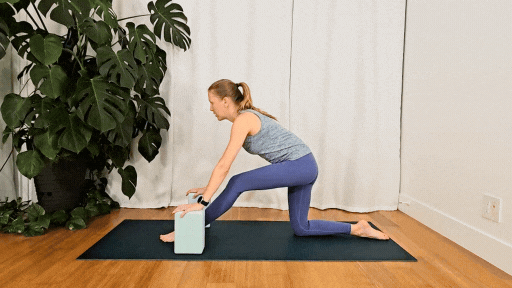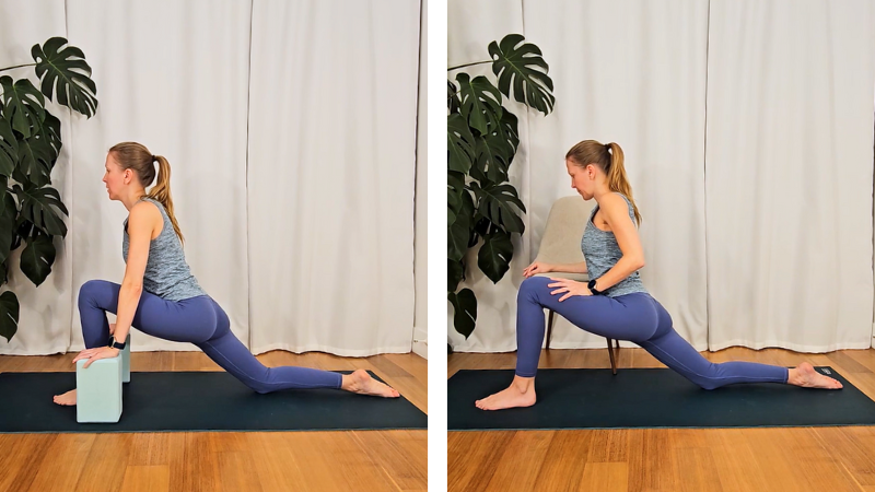 - Stay in your low lunge, but return to using your blocks or chair for support.
