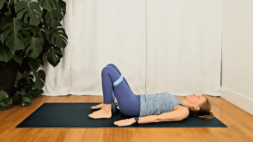- Press evenly into your feet and lift your hips into a bridge