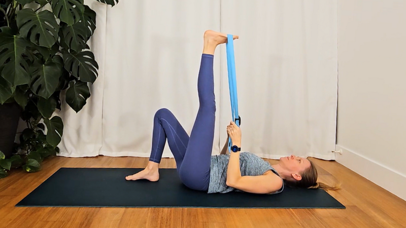 - Place your yoga strap around the ball of your right foot