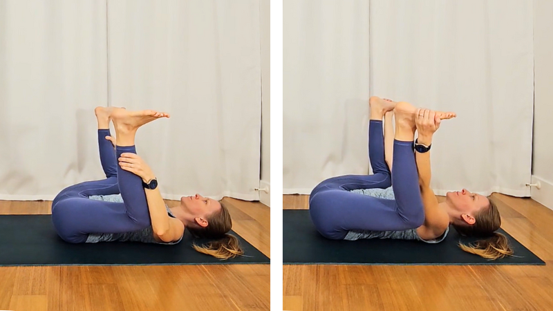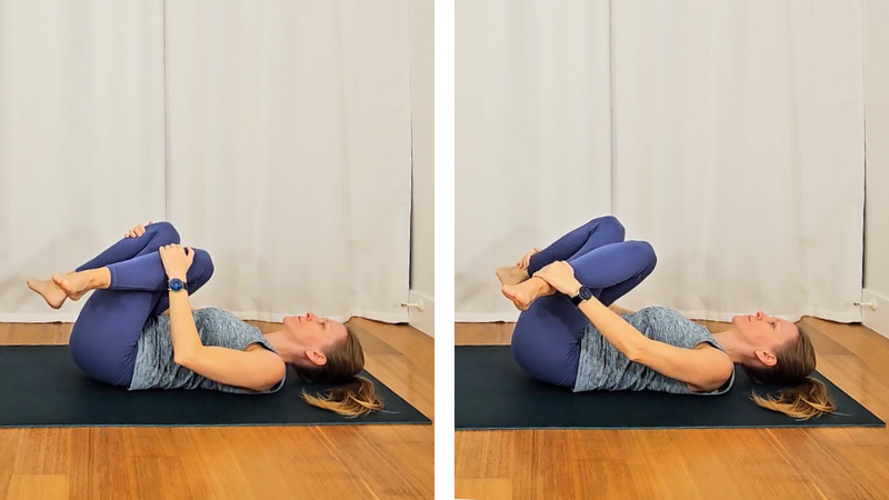- Grab your shins and draw your knees toward your chest
